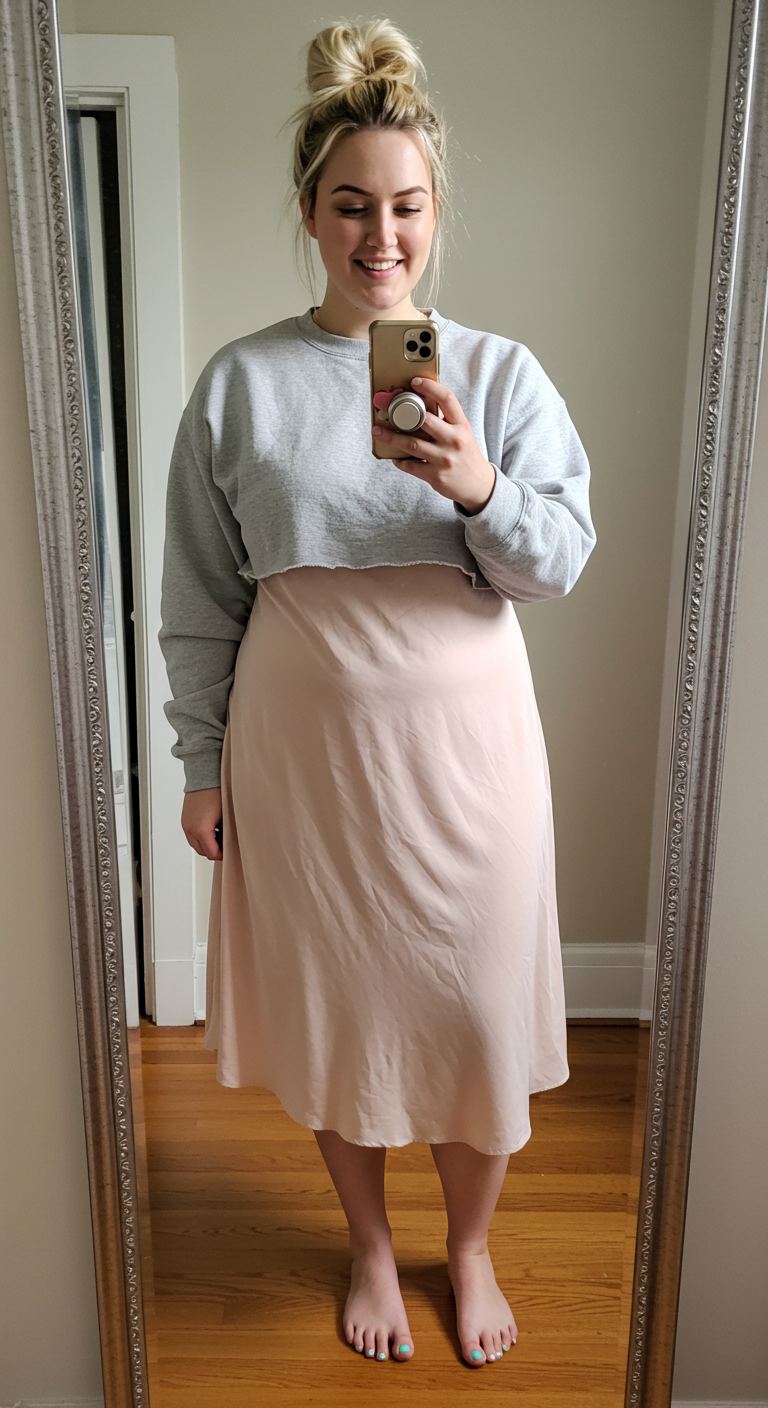 The unexpected fusion of a casual cropped sweatshirt over a fluid slip dress defines this effortlessly chic ensemble. The soft grey of the raw-hemmed top contrasts beautifully with the delicate, blush-toned dress, creating an appealing textural and stylistic blend. This versatile pairing works well for those who appreciate comfort without sacrificing sophistication, making it ideal for a relaxed brunch or a creative workday. The silhouette complements various body types by offering a relaxed fit that still drapes elegantly, emphasizing a modern, understated aesthetic.
