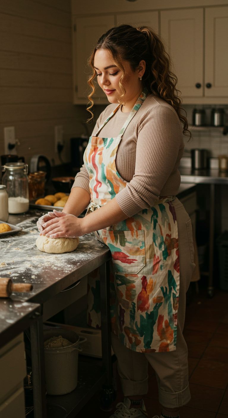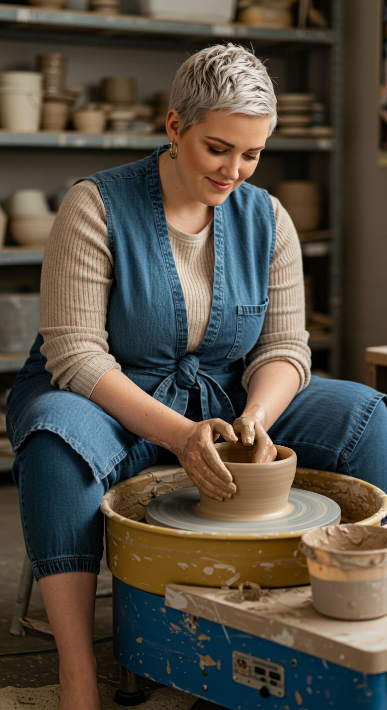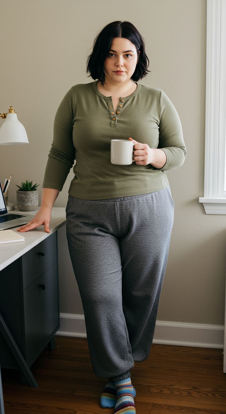 Layering a relaxed striped henley over soft grey joggers creates an effortlessly comfortable aesthetic perfect for at-home activities. The warm, neutral tones of the top complement the understated grey of the bottoms, ensuring a cohesive and approachable feel. This ensemble is ideal for those who prioritize comfort without sacrificing a put-together look, suiting various body types with its relaxed fit. It’s a prime choice for casual mornings, working from home, or relaxed weekend errands.