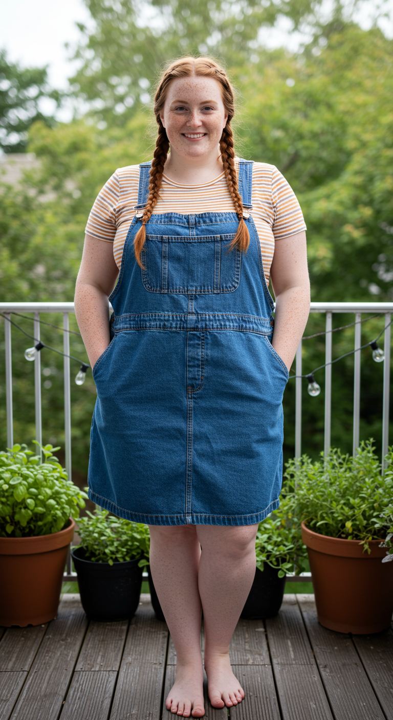 A delightful interplay of warm mustard yellow and crisp white stripes under a classic medium-wash denim creates a cheerful, approachable aesthetic. The denim overall dress offers a relaxed silhouette, providing comfort without sacrificing style, ideal for a variety of body types seeking a laid-back yet put-together vibe. Its simple, functional design makes it perfect for casual outings like farmers’ markets, weekend brunches, or relaxed park strolls. The combination of the soft striped tee and durable denim delivers a charmingly effortless ensemble that radiates youthful energy.