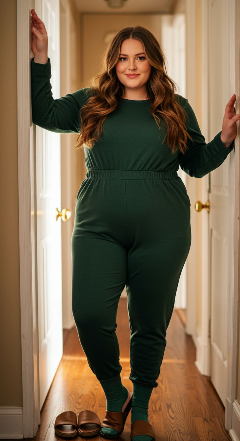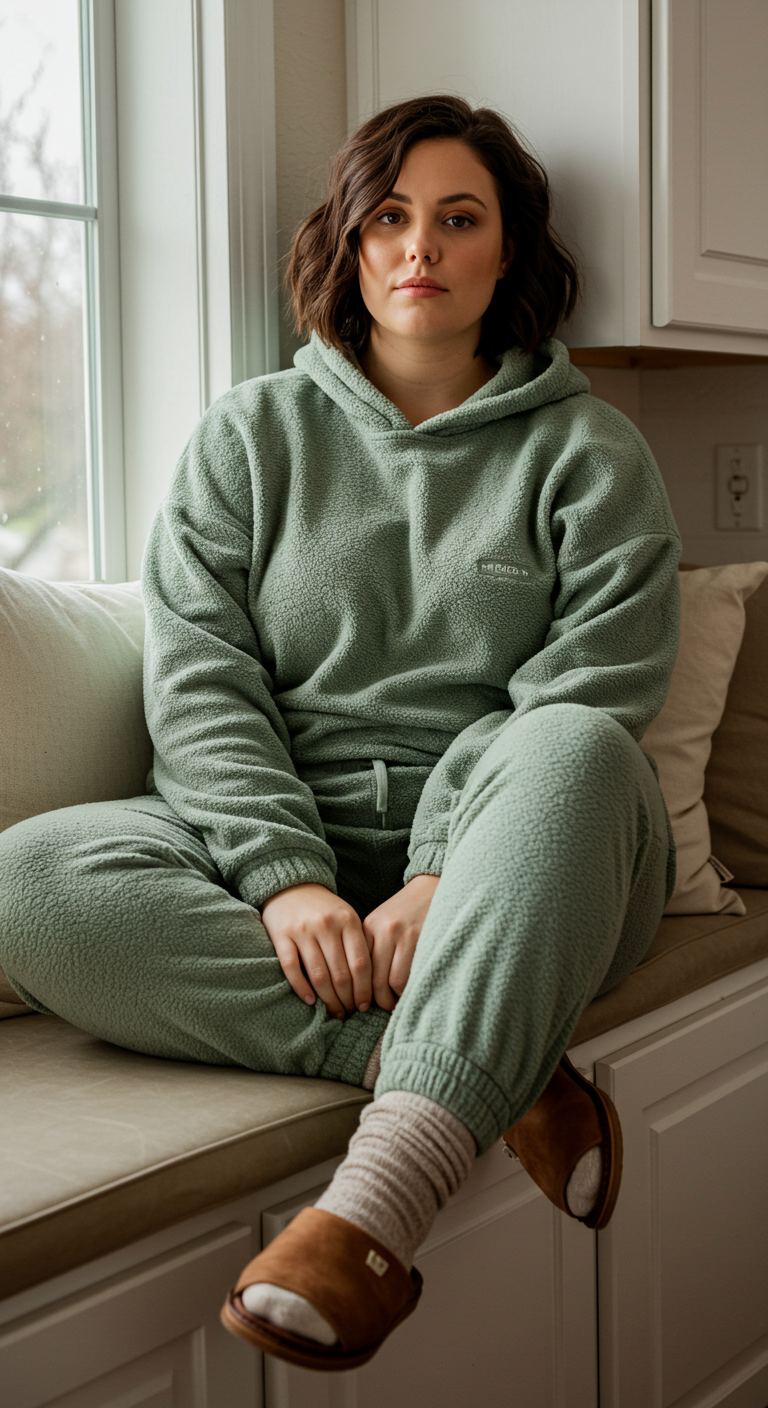 Monochromatic styling creates a cohesive and effortlessly comfortable aesthetic with this sage green fleece hoodie and matching jogger set. The plush texture of the fabric invites relaxation, making it ideal for casual home wear or running quick errands. This ensemble particularly suits those who prioritize comfort without sacrificing a well-coordinated appearance, complementing various body types with its relaxed fit. Paired with neutral socks and open-toe slippers, it’s a perfect choice for a cozy day in or a relaxed weekend outing.
