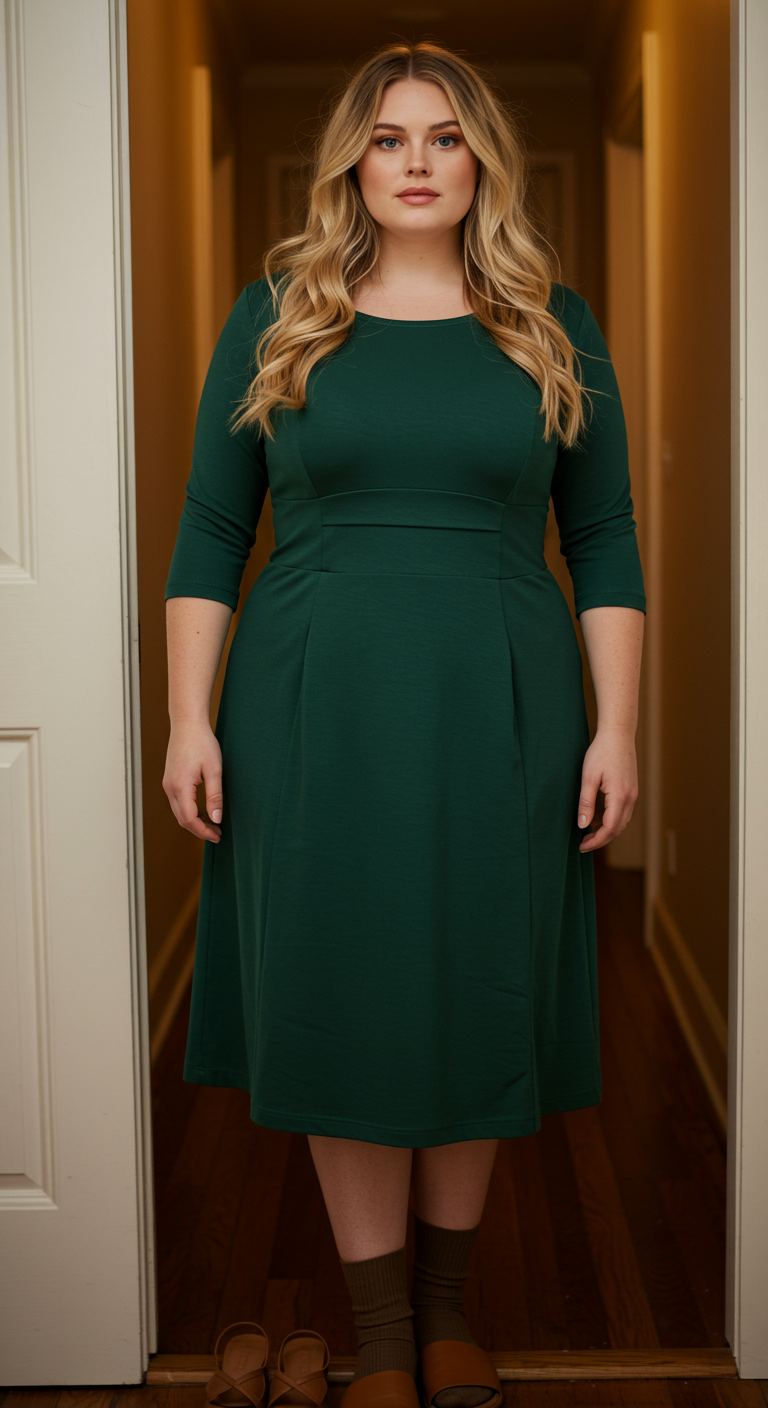 The rich emerald green of this midi dress immediately draws the eye, offering a sophisticated yet accessible color choice. Its flattering fit-and-flare silhouette, enhanced by a defined waistline and gentle pleats, complements a variety of body types, particularly those seeking to emphasize their natural waist. The three-quarter sleeves add a touch of demure style, making it suitable for casual work environments or refined daytime outings. Paired with simple slides and socks, this ensemble balances comfort with an understated chic, perfect for women who value effortless polish.