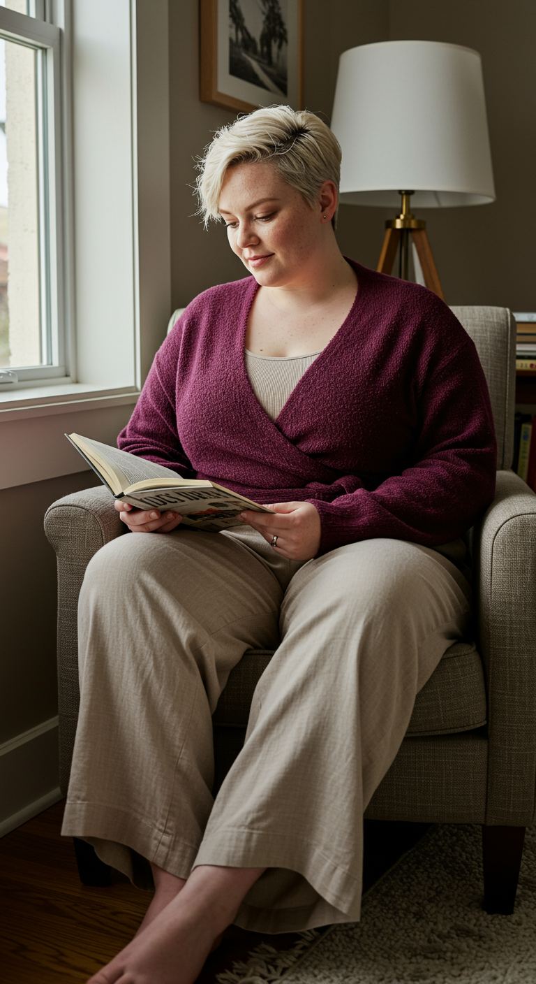 The deep berry wrap sweater, with its textured knit, harmonizes beautifully with the soft, neutral wide-leg trousers, creating a relaxed yet polished silhouette. This combination offers a flattering drape that suits various body types, particularly those seeking comfort without sacrificing style. The outfit is ideal for a casual weekend outing, a relaxed work-from-home day, or a cozy evening at a friend’s house, projecting an approachable and sophisticated aesthetic.