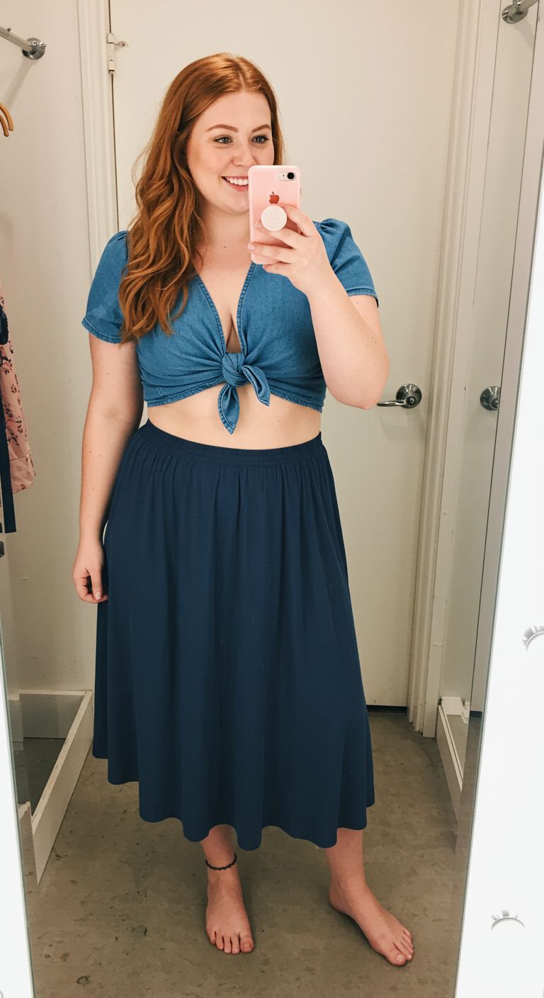 Drawing inspiration from a relaxed, bohemian sensibility, the outfit pairs a light wash denim-look tie-front crop top with a flowing, dark blue midi skirt. The contrasting yet complementary shades create a cohesive and effortless aesthetic. This ensemble would suit various body types, particularly those who appreciate a comfortable yet stylish silhouette, and is ideal for casual outings, beach days, or relaxed summer gatherings.