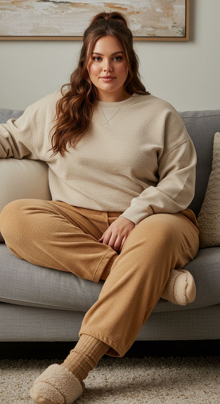 Perfect for cooler weather or a relaxed evening in, this outfit combines ultimate comfort with understated style. The textured cream sweatshirt pairs seamlessly with soft, tan fleece trousers, creating a monochromatic yet dynamic look. This ensemble would flatter various body types, particularly those who appreciate relaxed silhouettes and a minimalist aesthetic, making it ideal for casual home wear or a laid-back weekend.