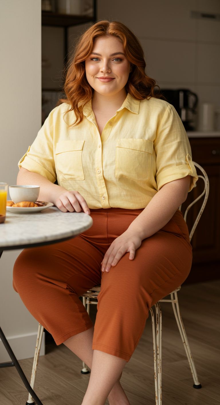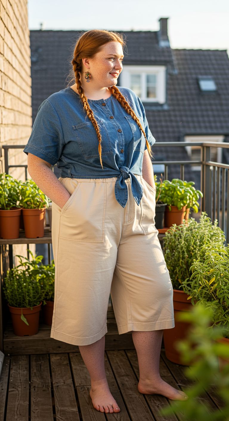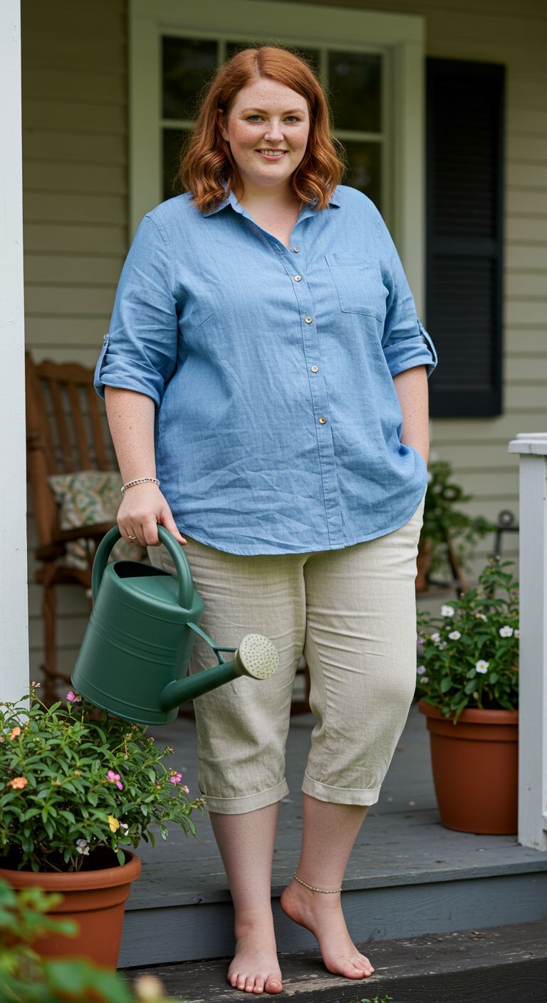 An effortlessly comfortable and breezy atmosphere defines this pairing of a light blue chambray shirt with neutral capri pants. The soft, breathable fabrics make it ideal for warmer weather, offering a relaxed yet put-together aesthetic. This casual ensemble works beautifully for those who favor comfort and understated elegance, suiting various body types with its forgiving silhouettes. It’s perfectly suited for garden parties, casual outings, or a leisurely day spent enjoying the outdoors.