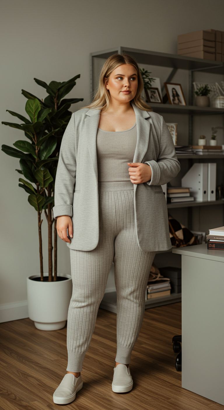 Layering a soft blazer over a coordinated ribbed knit set creates a relaxed yet polished aesthetic. The tonal grey palette, featuring a structured blazer and form-fitting top and pants, offers a sophisticated take on casual wear. This versatile combination is ideal for various body types seeking comfortable elegance, particularly those who appreciate refined neutrals and subtle texture. Perfect for a work-from-home day, a casual office environment, or a stylish weekend outing, this outfit effortlessly blends comfort with an elevated sensibility.