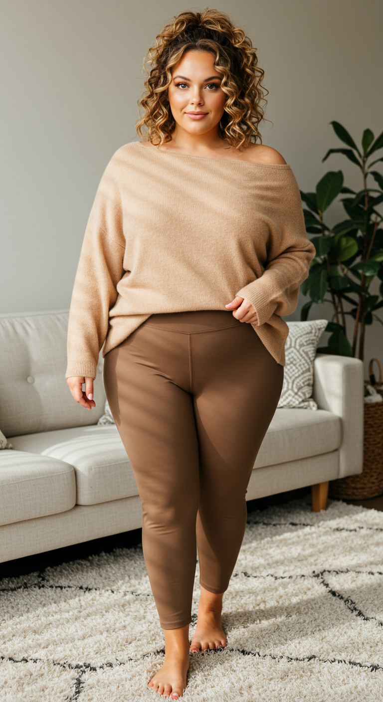 Perfect for a relaxed day at home or a casual coffee run, this outfit embodies effortless comfort. The soft, off-the-shoulder camel sweater offers a touch of sophistication while maintaining a laid-back vibe, beautifully paired with form-fitting brown leggings. This monochrome palette creates a cohesive and elongating effect, ideal for various body types seeking comfortable yet chic attire. It’s a versatile choice for those who prioritize ease and a minimalist aesthetic in their everyday style.