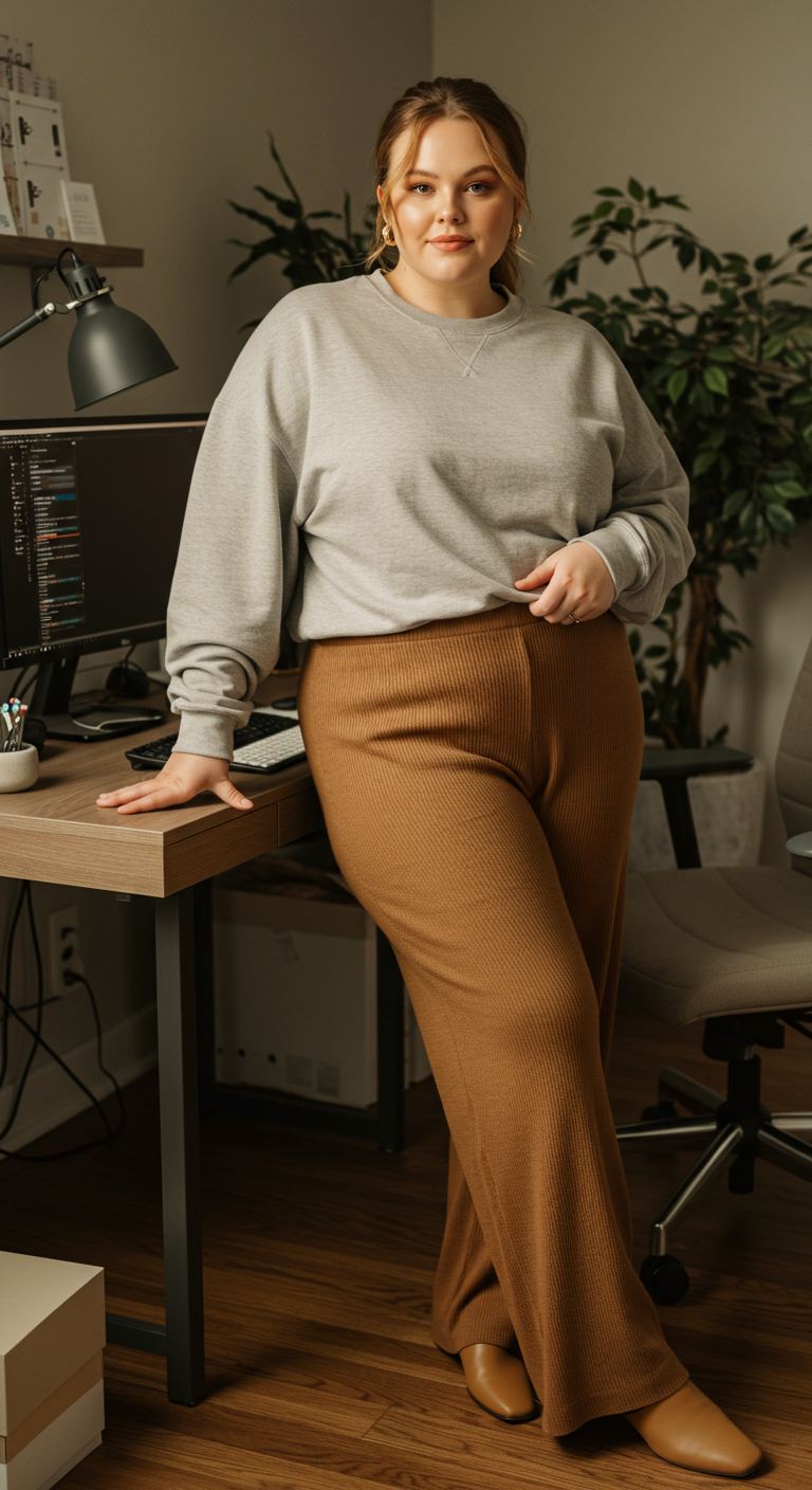 Inspired by minimalist ’90s loungewear, this ensemble thoughtfully pairs comfort with understated style. The soft grey crewneck sweatshirt offers a relaxed fit, beautifully complemented by the rich caramel ribbed knit trousers that introduce texture and a flowing silhouette. This outfit works wonderfully for those who prioritize ease and modern simplicity, suiting various body types with its forgiving lines. Ideal for casual work-from-home days, relaxed errands, or cozy weekend gatherings, it balances a polished yet effortless aesthetic.
