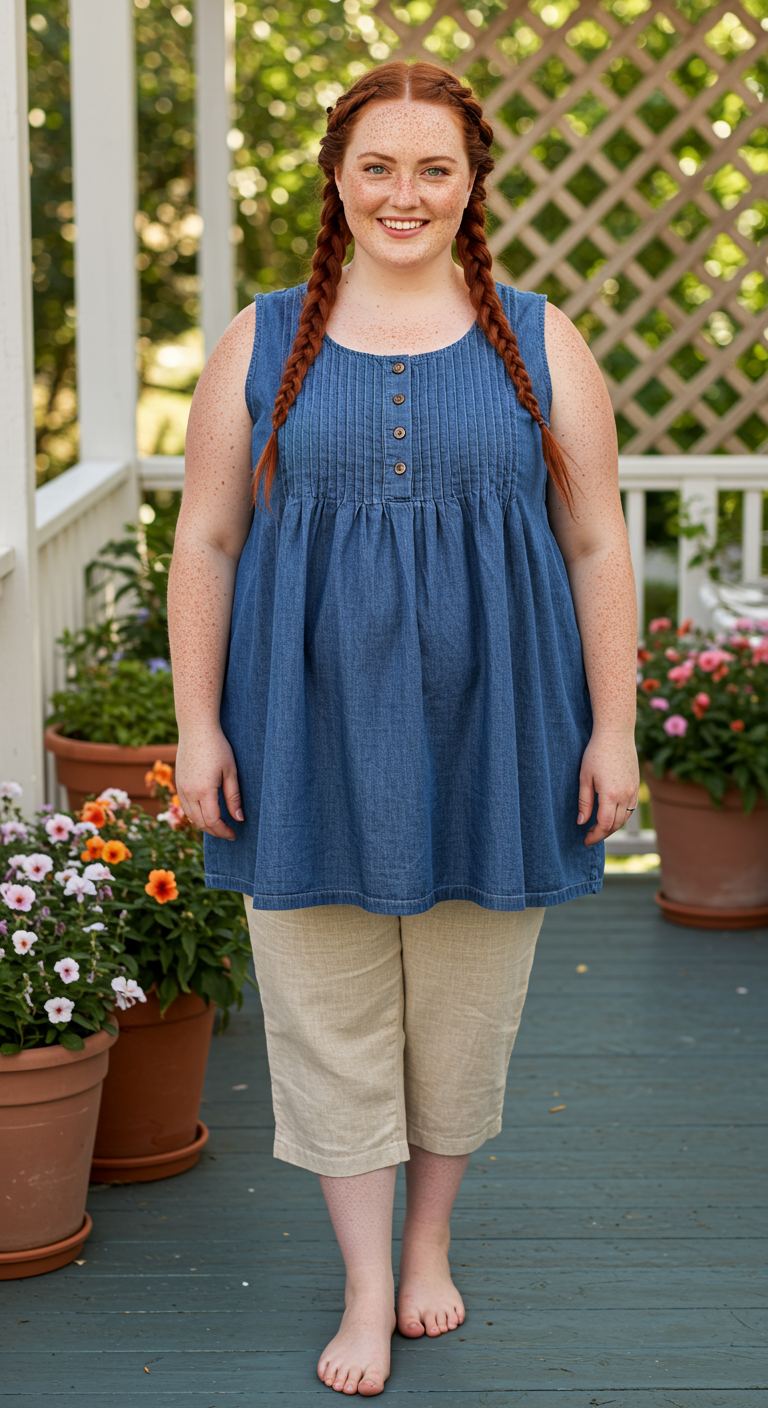 The soft, washed denim of the sleeveless tunic offers a relaxed yet refined texture, beautifully contrasted by the earthy linen blend capris. This pairing creates an effortlessly comfortable and stylish warm-weather ensemble, ideal for those who appreciate natural fibers and a laid-back aesthetic. The tunic’s babydoll silhouette and pintuck detailing provide a flattering drape, complementing most body types by offering ease without sacrificing shape. It’s a perfect choice for casual outings, garden parties, or relaxed weekend gatherings, embodying a fresh and approachable personal style.