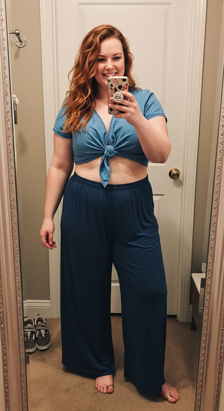 The unique blend of a casual tied denim crop top with flowing palazzo pants creates an effortlessly chic and comfortable aesthetic. This ensemble, with its relaxed silhouettes and rich blue tones, offers a flattering option for various body types, particularly those seeking to balance proportions with a defined waist and ample leg room. Ideal for warm weather outings, casual brunches, or relaxed vacation settings, the outfit’s ease and breezy feel make it a versatile choice for a laid-back personal style.