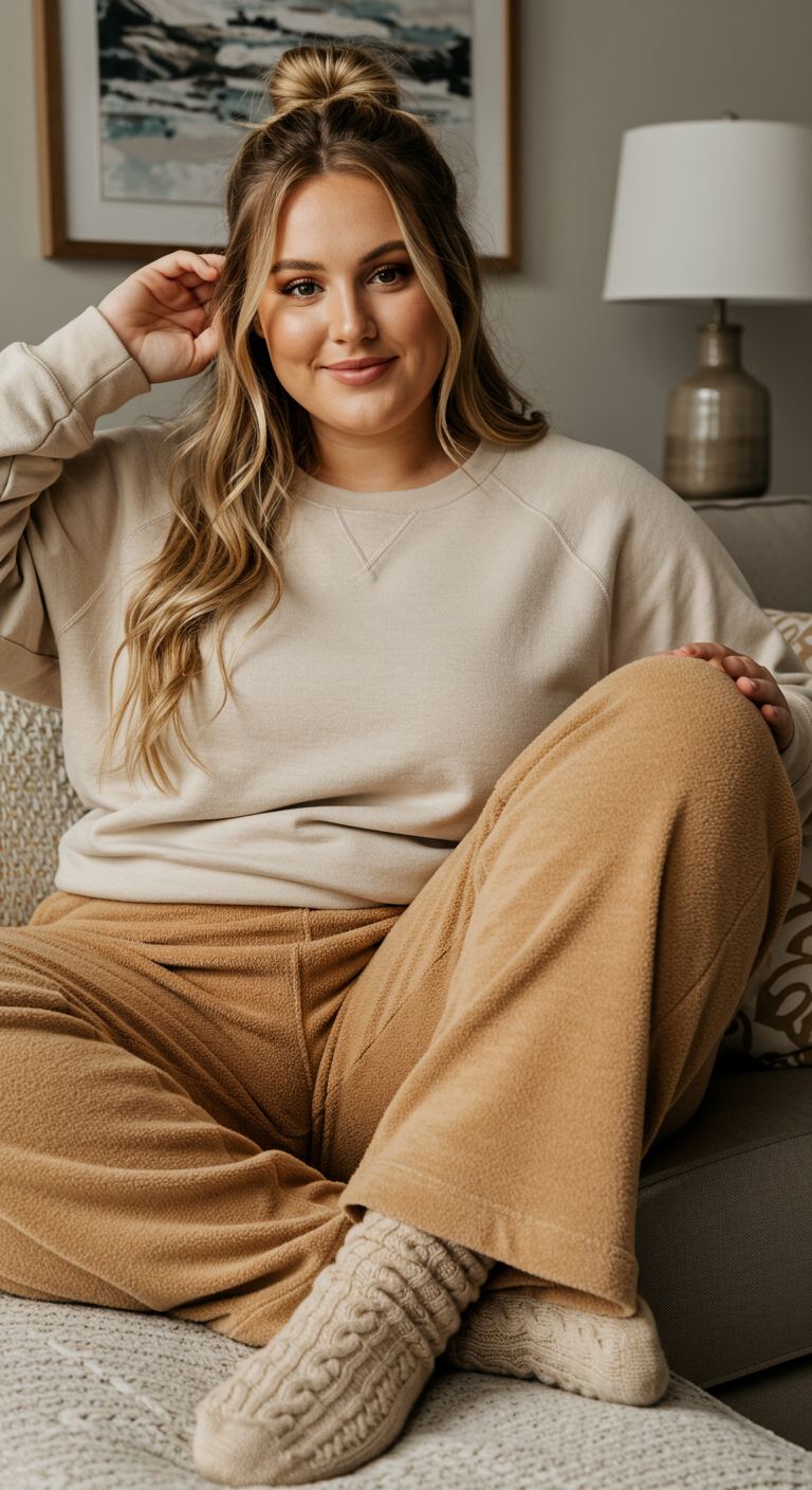 The standout feature of this casual ensemble is the plush fleece pullover, offering a relaxed fit perfect for unwinding. Its neutral cream color is subtly accented by a deep plum placket and elbow patches, adding a touch of understated sophistication. Paired with coordinating camel leggings and tall, intricately cable-knit socks, this outfit creates a harmonious blend of textures and warmth. Ideal for a relaxed weekend at home or a casual gathering with friends, this comfortable yet stylish look suits various body types seeking effortless comfort.