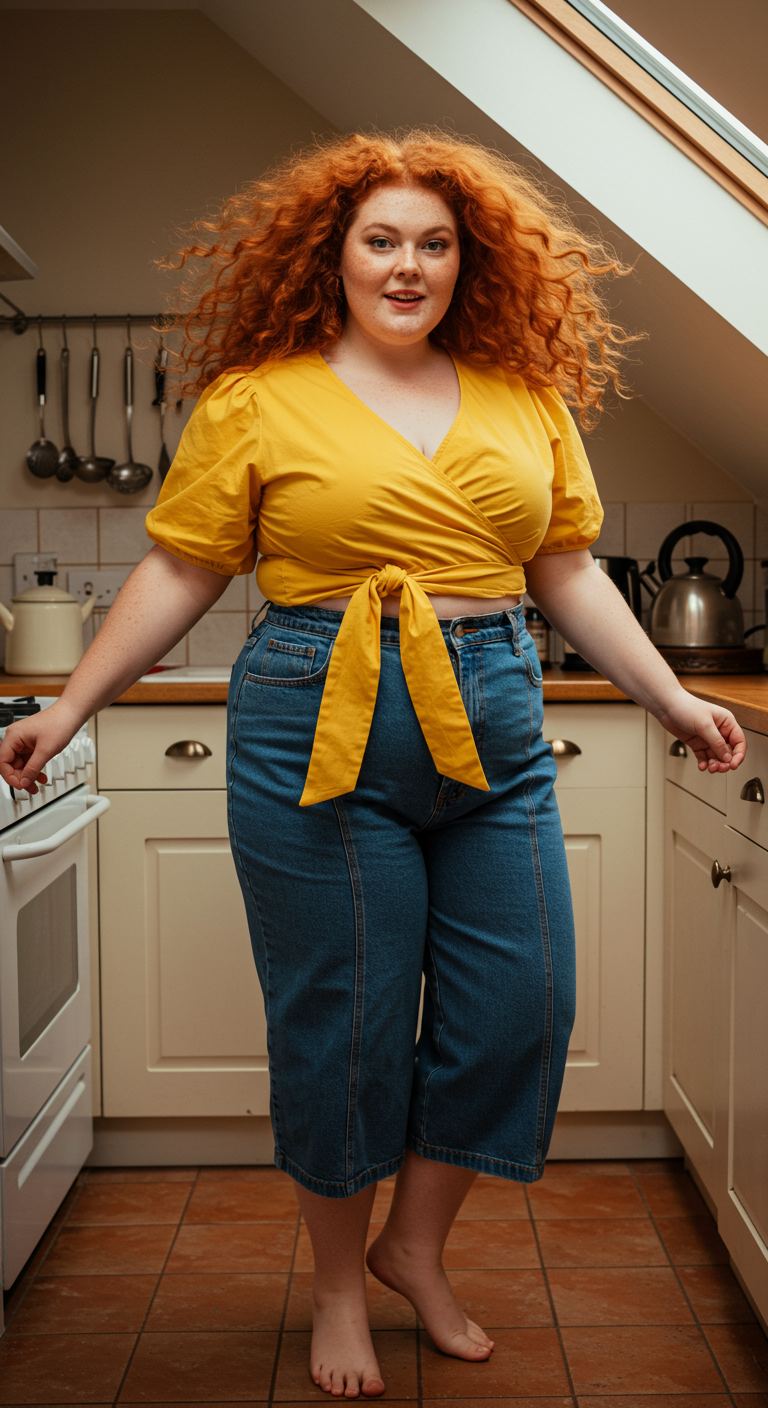 Perfect for a casual weekend brunch or a relaxed afternoon outing, this ensemble combines comfort with vibrant style. The bright marigold wrap top, featuring a charming tie-front detail and puff sleeves, offers a flattering silhouette that accentuates the waist. Paired with high-waisted, wide-leg denim culottes, the outfit balances proportions beautifully, making it an excellent choice for hourglass or pear body types seeking a playful yet chic aesthetic. This look works well for those who appreciate a touch of retro flair and effortless charm in their everyday wear.