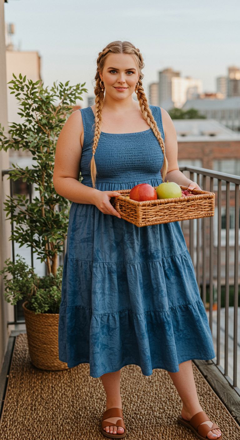 The serene blue of this tiered midi dress offers a refreshing and casual aesthetic, perfectly suited for relaxed daytime events. Its smocked bodice provides a comfortable, flattering fit for various body types, while the flowing skirt offers ease of movement and a touch of effortless charm. This ensemble is ideal for those who appreciate understated elegance and comfort, making it perfect for a farmers market visit, a casual brunch, or an afternoon spent enjoying the city’s green spaces.