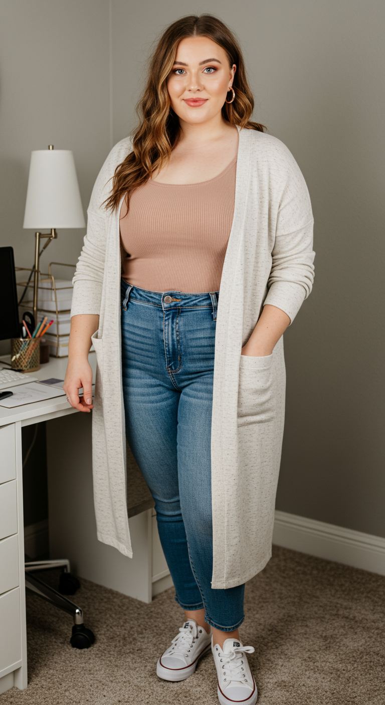 Perfect for a relaxed day of running errands or a casual work-from-home setup, this ensemble offers both ease and understated style. The long, speckled cream cardigan adds a soft, elongated silhouette over a ribbed nude tank, creating a harmonious color palette. Paired with classic blue jeans and white sneakers, this outfit is ideal for those who favor comfort without sacrificing a polished, approachable aesthetic. It particularly complements pear and hourglass figures by providing a graceful, flowing layer.