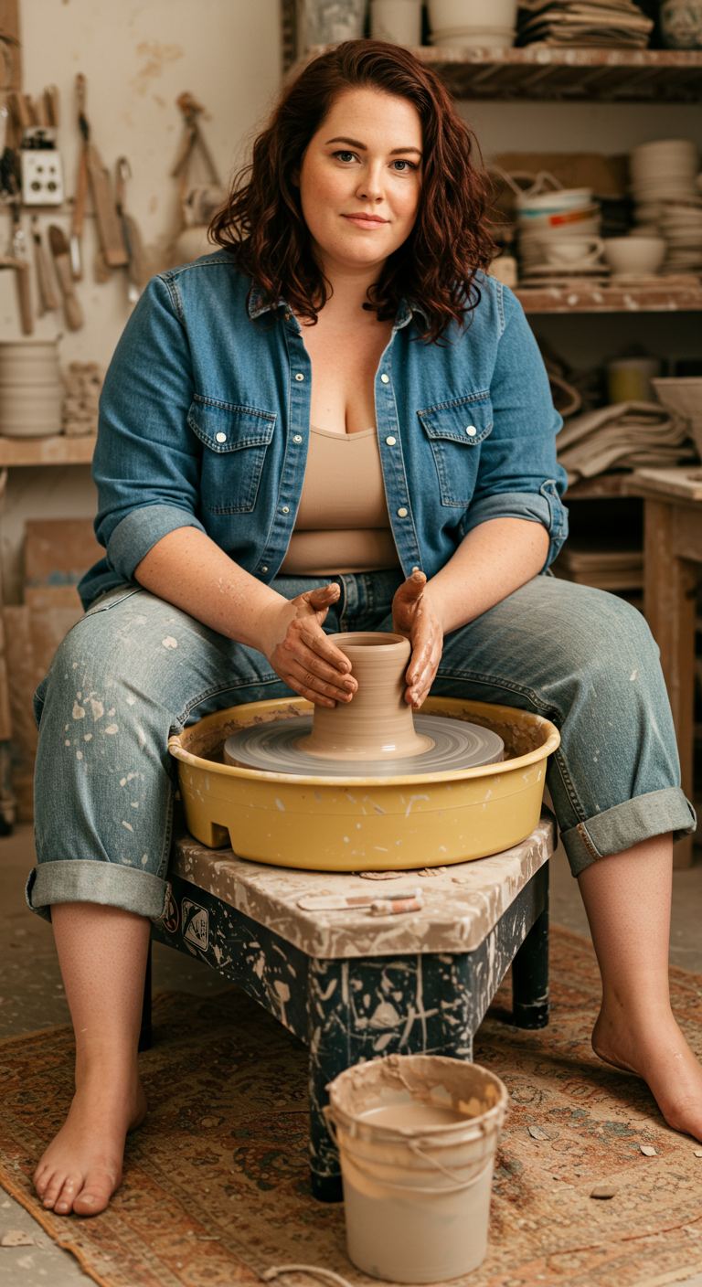 Exuding a relaxed and effortlessly creative vibe, this outfit centers on comfort without sacrificing style. A classic medium-wash denim shirt, worn open over a soft, neutral-toned camisole, pairs perfectly with cuffed, light-wash jeans. This ensemble is ideal for those with a casual personal style or an artistic inclination, offering a flattering and comfortable fit for various body types. It’s perfectly suited for a creative workshop, a casual day out, or any setting where practical ease meets understated cool.