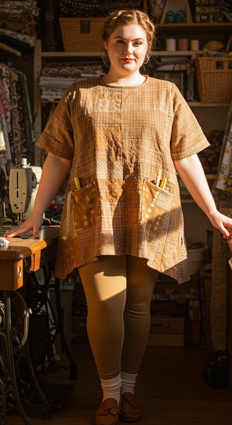The intricate patchwork tunic, featuring varied plaid and patterned fabrics in warm, earthy tones, immediately draws the eye with its creative, handcrafted appeal. This loose-fitting garment offers both comfort and distinctive style, ideal for individuals who appreciate artisanal fashion and relaxed silhouettes. Paired with coordinating tan leggings and simple brown loafers, it creates a cohesive and effortlessly chic look. This outfit is perfect for casual outings, creative pursuits, or a comfortable day at home, suiting various body types with its forgiving drape.
