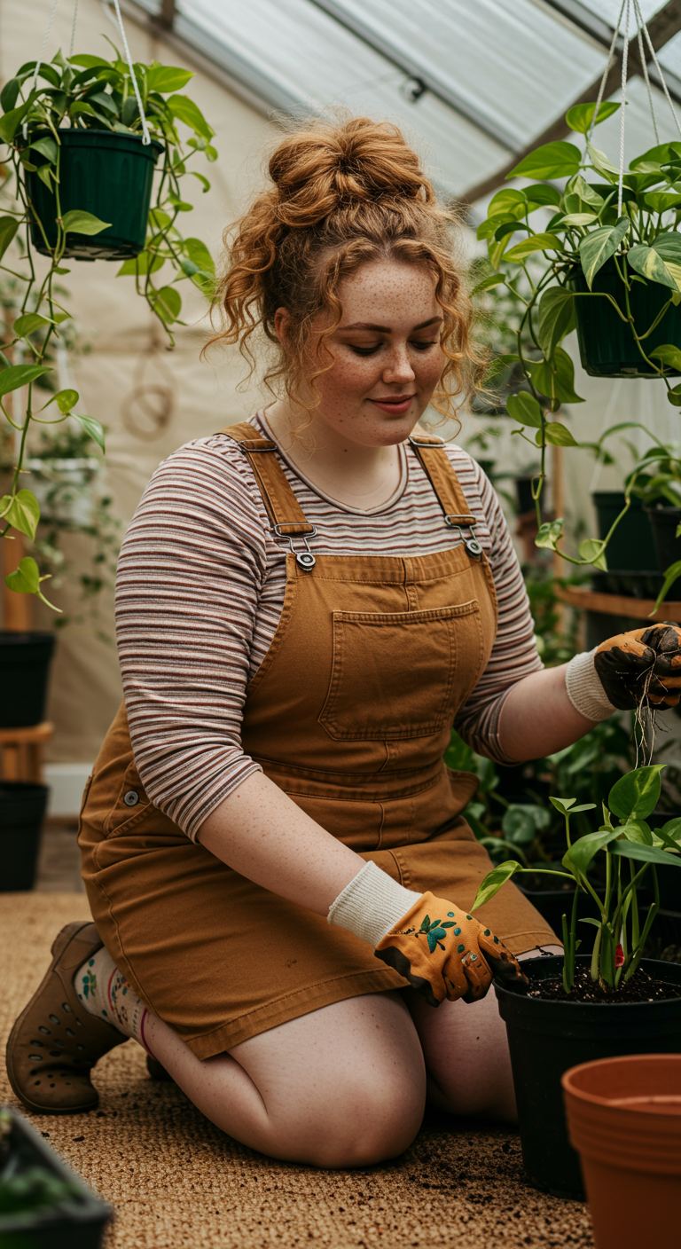 The striped long-sleeve top and the warm brown overall dress create a cohesive, earthy aesthetic. This relaxed yet put-together ensemble is ideal for those who appreciate comfort without sacrificing style, particularly suiting a casual or bohemian personal style. The layering of textures and complementary colors makes it perfect for a relaxed weekend outing, a creative hobby session, or a casual garden party during cooler months.