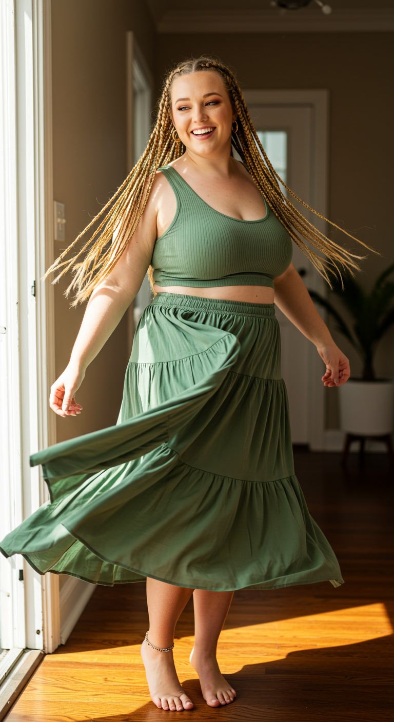 Perfect for warm weather or relaxed indoor days, this ensemble prioritizes comfort without sacrificing a cohesive aesthetic. The soft grey V-neck tee pairs effortlessly with olive green drawstring joggers, creating a soothing color palette ideal for unwinding. This laid-back combination offers a flattering silhouette for various body types, particularly those who appreciate relaxed fits and natural tones. It’s an excellent choice for casual home activities, running quick errands, or enjoying a leisurely weekend morning.
