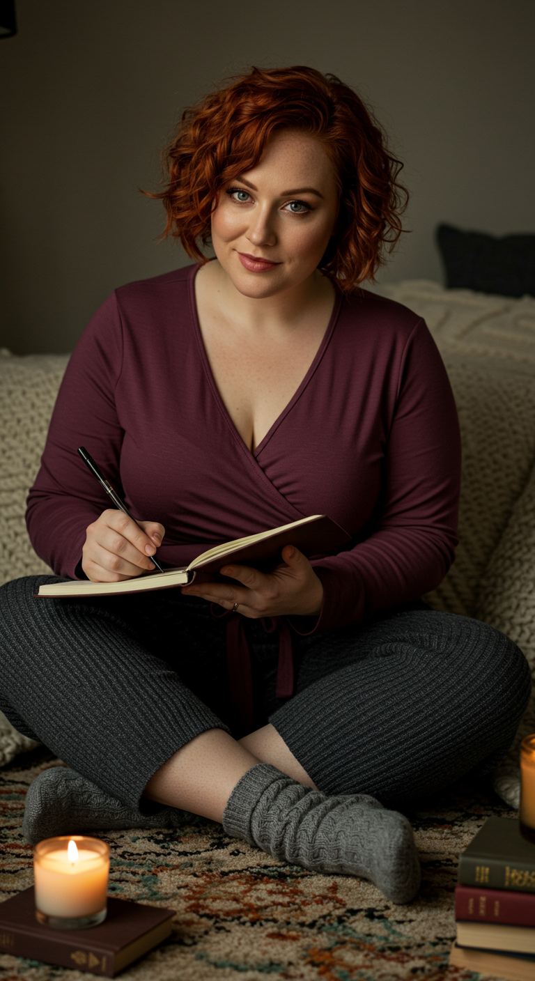 The rich plum wrap top beautifully complements the charcoal ribbed pants, creating a harmonious and relaxed aesthetic. This pairing, enhanced by the soft texture of knitted socks, offers an ideal blend of comfort and understated style. The outfit is particularly well-suited for a relaxed personal style and can flatter various body types due to its forgiving silhouettes. Perfect for cozy evenings at home, a casual weekend, or a laid-back creative session.