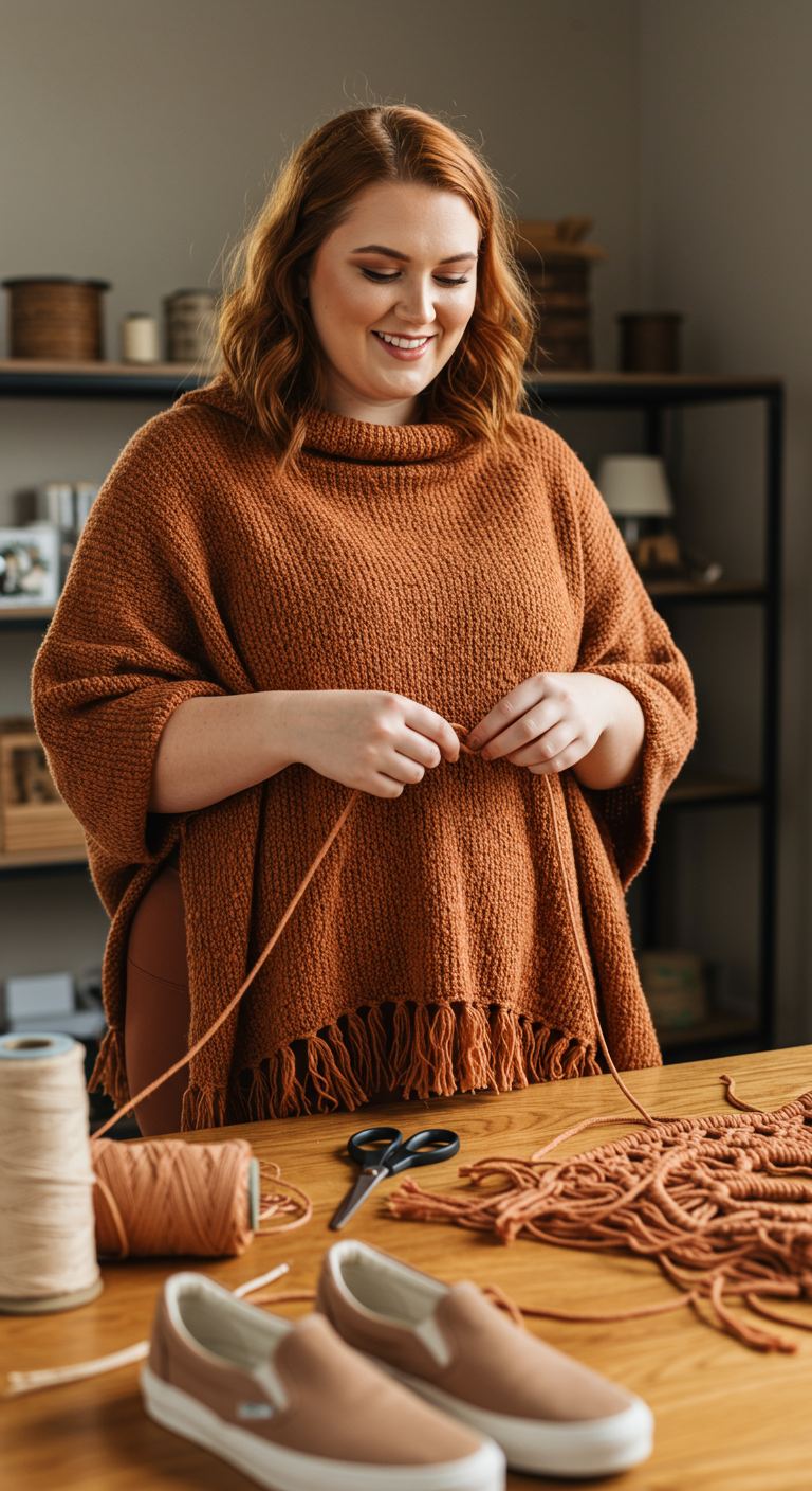 Perfect for cooler autumn days or cozy evenings indoors, this ensemble exudes relaxed sophistication. The rust-colored, wide-knit poncho with its fringe detail offers a comfortable yet chic silhouette, providing ample coverage while remaining stylish. This adaptable piece suits various body types, particularly flattering those who appreciate a relaxed fit without sacrificing elegance. Pair it with slim-fit trousers or leggings for an ideal look for casual gatherings, creative pursuits, or a relaxed weekend outing.