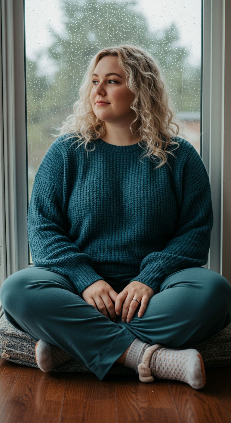 The striking monochromatic palette of deep teal sets this comfortable loungewear apart, creating a cohesive and polished aesthetic even for relaxed settings. A chunky waffle-knit sweater offers a tactile contrast to the smooth, flowing fabric of the matching trousers, emphasizing coziness without sacrificing style. This relaxed yet refined pairing is ideal for those who value comfort and a minimalist approach to dressing, suiting various body types with its forgiving silhouettes. Perfect for a cozy day at home, a casual coffee run, or a relaxed weekend getaway, this outfit balances ease with sophisticated color coordination.