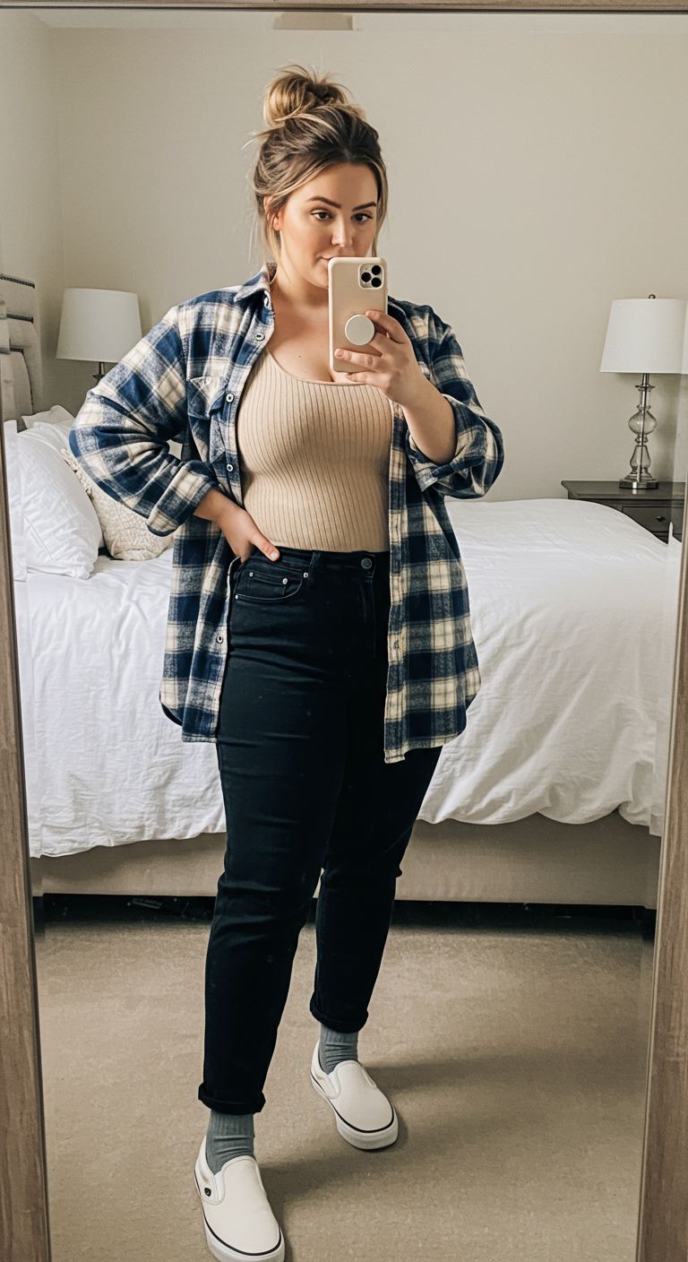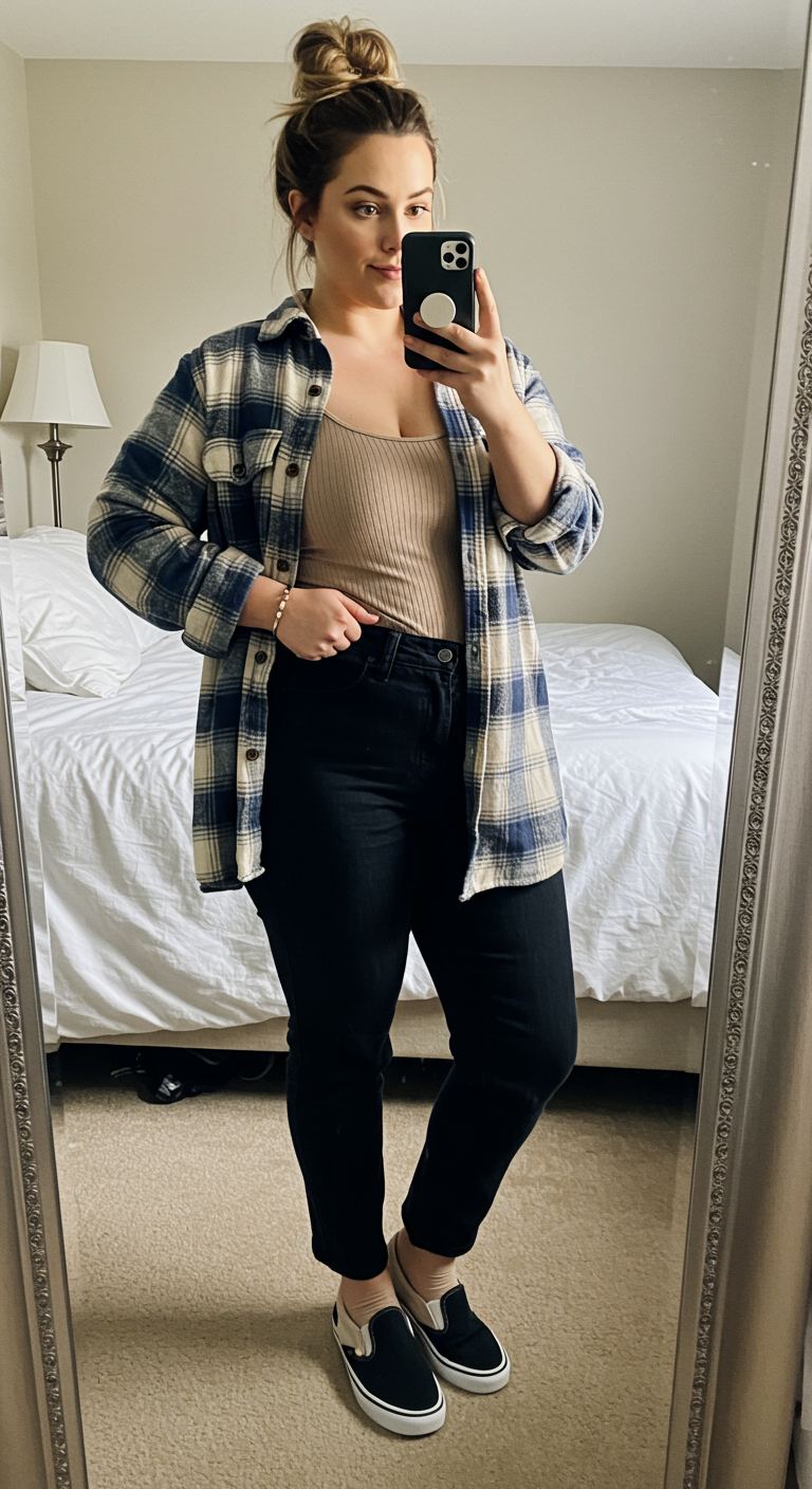 Drawing inspiration from a relaxed, alternative aesthetic, this outfit combines comfort with casual style. The oversized blue and cream plaid flannel, worn open, layers effortlessly over a fitted ribbed beige tank top, creating a balanced silhouette. Paired with dark wash, cuffed jeans and white slip-on sneakers with grey socks, this look is ideal for pear and hourglass body types who appreciate a laid-back yet put-together vibe. It’s a perfect choice for weekend outings or casual social gatherings.