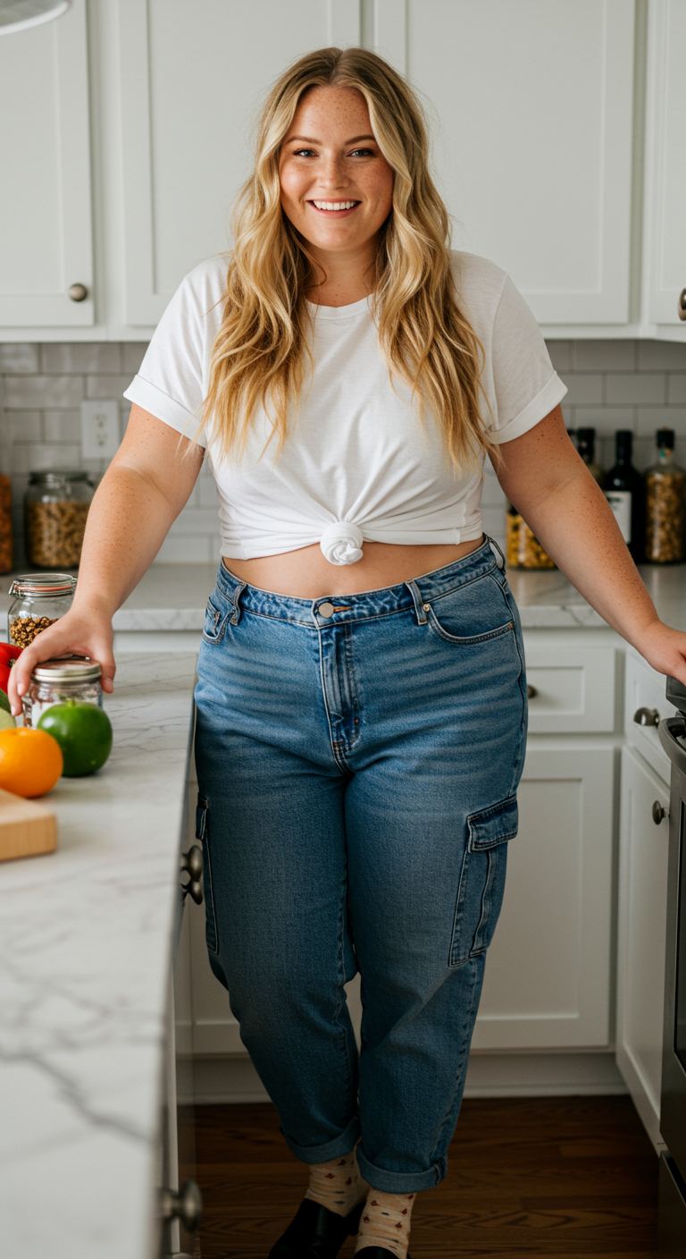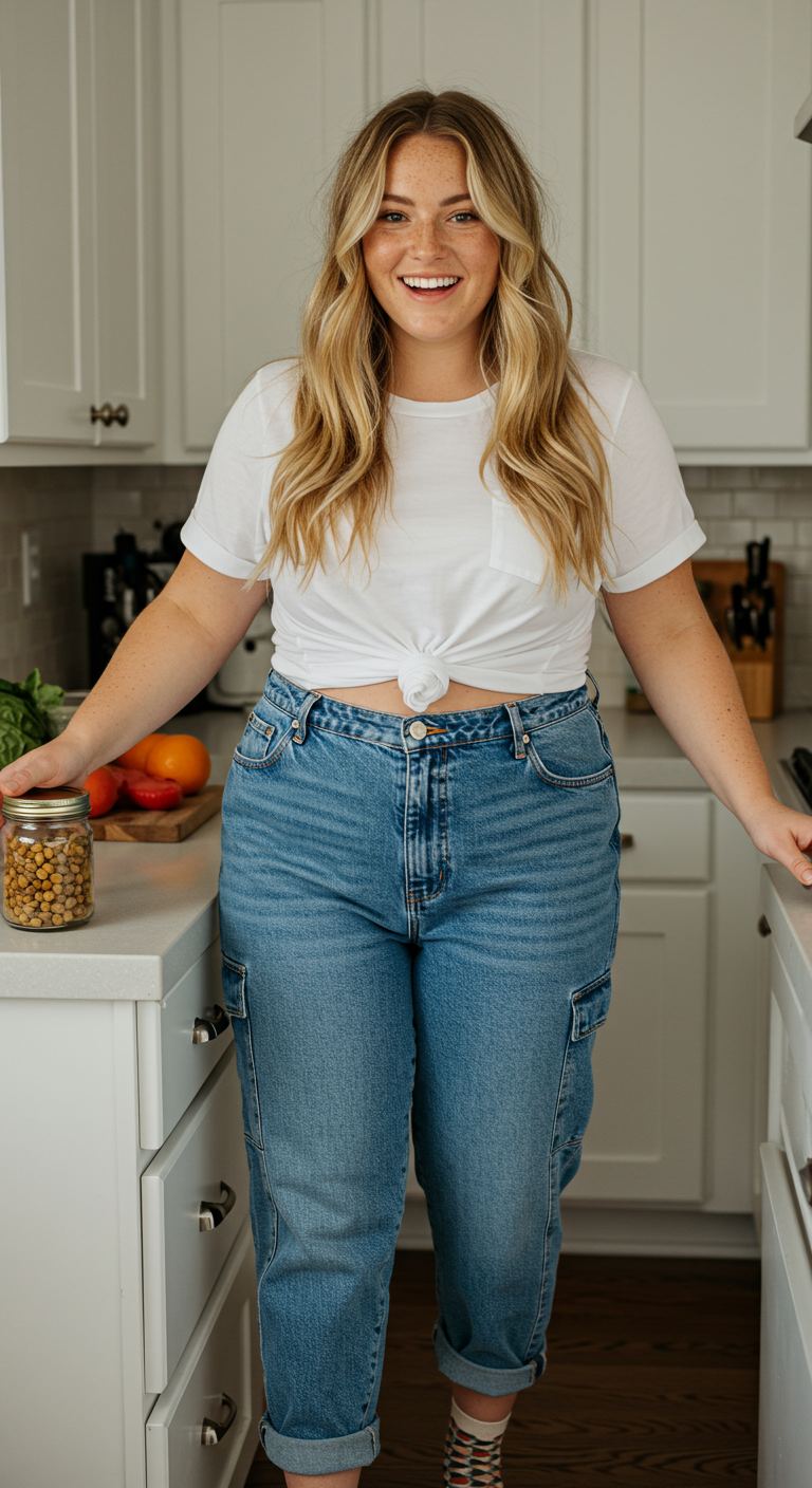 A classic white and medium-wash denim color story defines this effortlessly relaxed outfit. The simple white tee, tied at the waist, pairs perfectly with high-waisted cargo jeans, creating a balanced and comfortable silhouette. This adaptable pairing suits various body types and personal styles focused on practical ease, making it ideal for casual outings, running errands, or simply enjoying a relaxed day at home. The cargo pockets add a subtle utilitarian detail to the otherwise straightforward ensemble, enhancing its modern appeal.