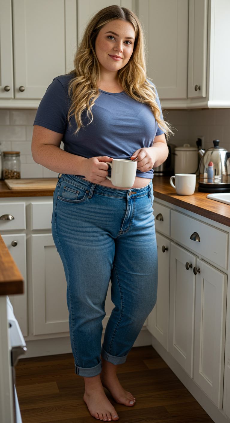 The soft, muted blue t-shirt creates a serene and comfortable foundation for this casual ensemble. Paired with classic medium-wash jeans, the look achieves an effortless appeal, perfect for relaxed mornings or low-key weekends. The slightly cropped tee and cuffed denim offer a modern, proportional balance, flattering various body types, especially those seeking comfort without sacrificing style. This simple yet effective combination suits everyday errands, coffee dates, or working from home.