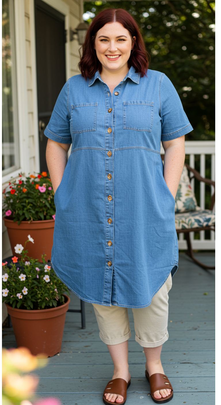 A relaxed, approachable vibe defines this casual ensemble, perfect for weekend outings or comfortable everyday wear. The denim tunic dress, with its functional front pockets and natural-toned buttons, offers a flattering drape that complements various body types. Paired with light-colored capri pants and simple slide sandals, this look achieves a balanced, easygoing aesthetic. It’s an ideal choice for women seeking comfort without compromising a put-together appearance in warmer weather.