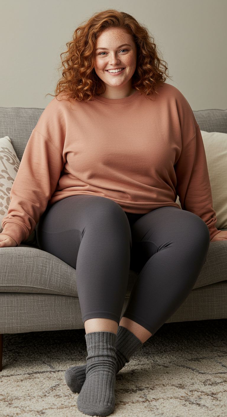Perfect for cooler weather, this relaxed ensemble offers ultimate comfort for a leisurely day at home or casual errands. The oversized terracotta crewneck sweatshirt provides a soft, inviting feel, complemented by the sleek, dark grey leggings. This combination creates a balanced silhouette that flatters many body types, especially those who appreciate ease and understated style. Ribbed grey socks complete the relaxed aesthetic, making it an ideal choice for a cozy weekend or a quiet evening indoors.