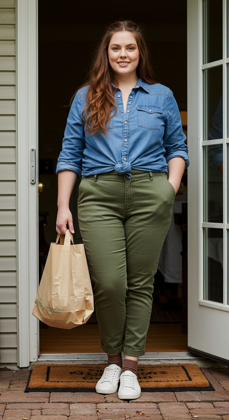 The soft texture of the chambray button-down creates an approachable and relaxed aesthetic, perfectly complemented by the fitted olive green trousers. This combination offers a balanced silhouette, ideal for various body types seeking comfortable yet polished everyday wear. The tied waist of the shirt adds a touch of casual flair, making it suitable for errands, casual outings, or weekend brunches. White sneakers complete the ensemble, reinforcing its relaxed and contemporary appeal.