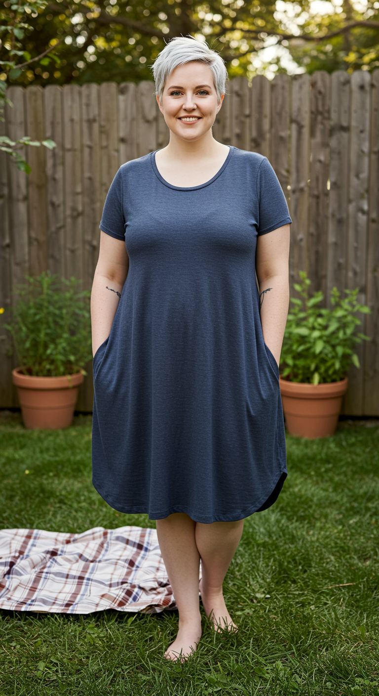 The unique appeal of this outfit lies in its understated simplicity, offering a versatile foundation for various personal styles. A relaxed-fit midi dress in a muted blue hue provides a comfortable silhouette that gently skims the body, making it ideal for those who favor ease and movement. This piece, with its practical side pockets and soft jersey fabric, works well for a casual weekend outing, a relaxed coffee date, or even a comfortable travel ensemble. It particularly complements pear or apple body shapes, as the A-line cut gracefully drapes without clinging.