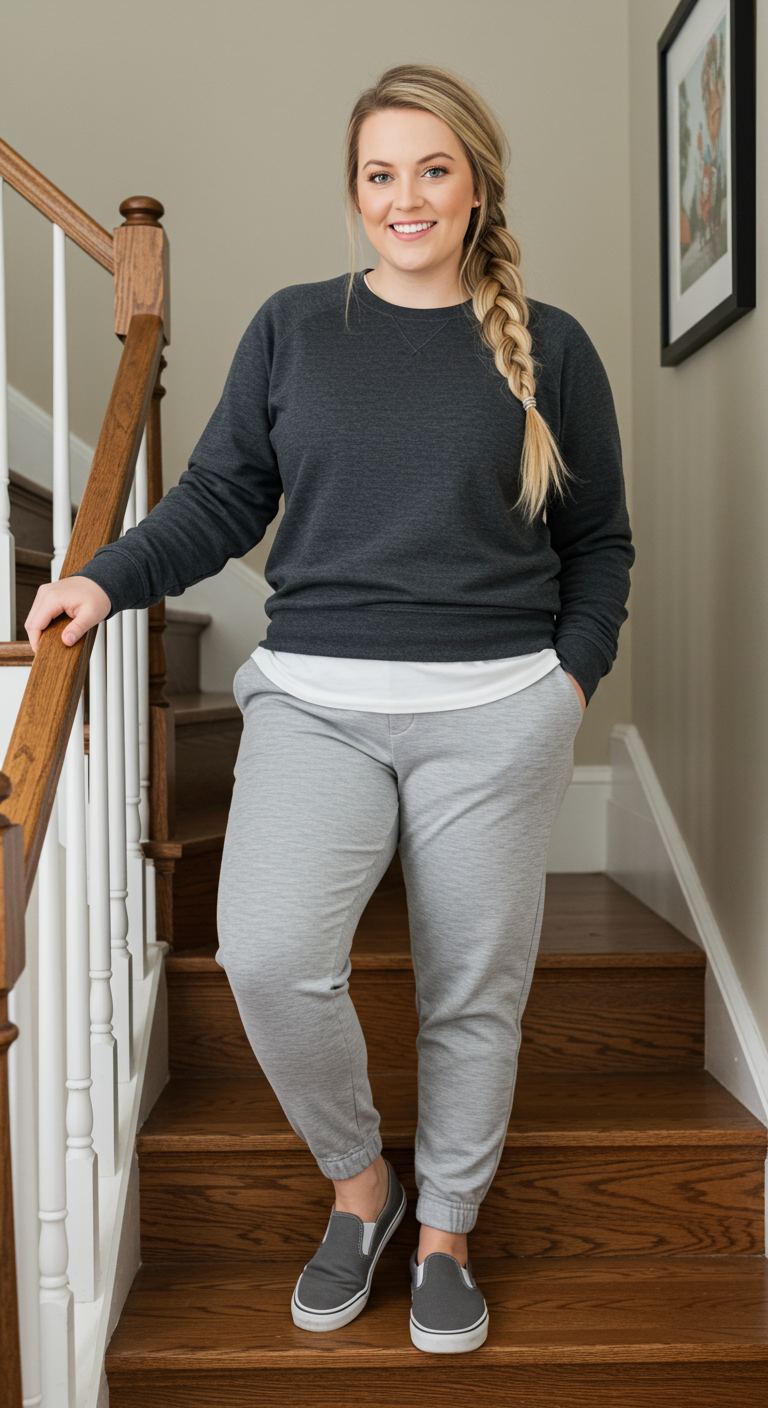 The relaxed charcoal sweatshirt, layered over a crisp white tee, creates a depth and visual interest that elevates simple loungewear. Paired with soft grey joggers and coordinating slip-on sneakers, the outfit offers a monochromatic base with a subtle textural contrast. This comfortable yet stylish combination is ideal for a casual day at home, running errands, or a relaxed weekend outing, suiting various body types with its forgiving silhouette and effortless appeal.