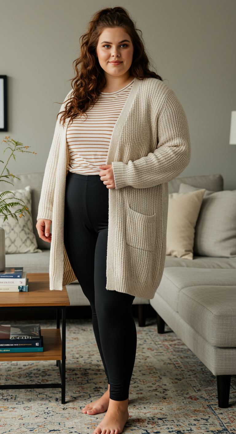 The long, cream-colored ribbed knit cardigan instantly elevates this relaxed ensemble, offering both warmth and a touch of sophisticated texture. Layered over a subtle striped t-shirt and classic black leggings, the outfit creates a balanced silhouette that is both comfortable and stylish. This versatile look is perfect for casual outings, working from home, or relaxed weekend activities, suiting various body types with its forgiving yet refined lines.