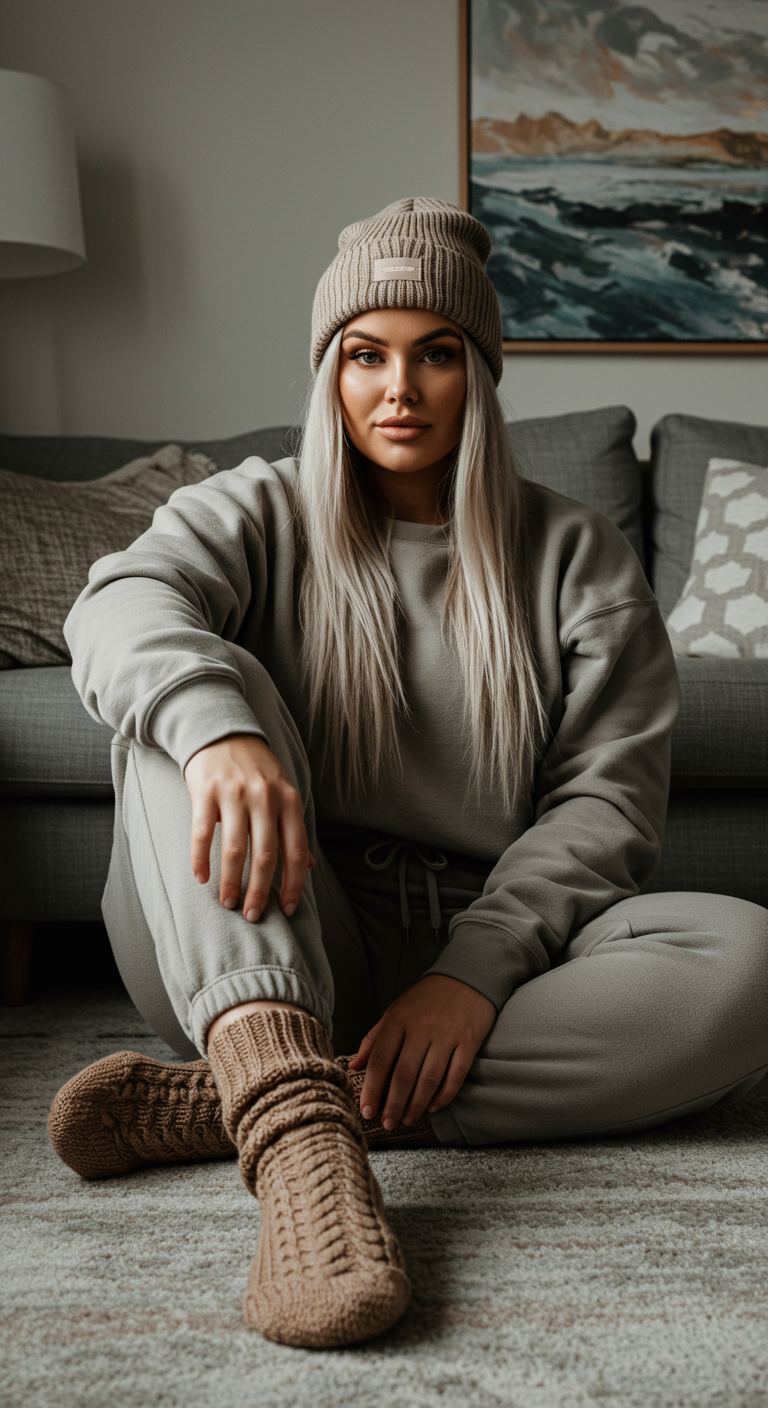 The ribbed knit beanie in a warm beige hue immediately sets a relaxed and inviting tone for this monochromatic loungewear ensemble. A matching sage green sweatshirt and joggers create a cohesive, comfortable base, while chunky knitted slipper socks in a complementary brown add a touch of texture and warmth. This casual yet stylish pairing is ideal for a relaxed weekend at home or a cozy coffee shop outing, suiting various body types with its forgiving silhouette and appealing to those who favor minimalist comfort.