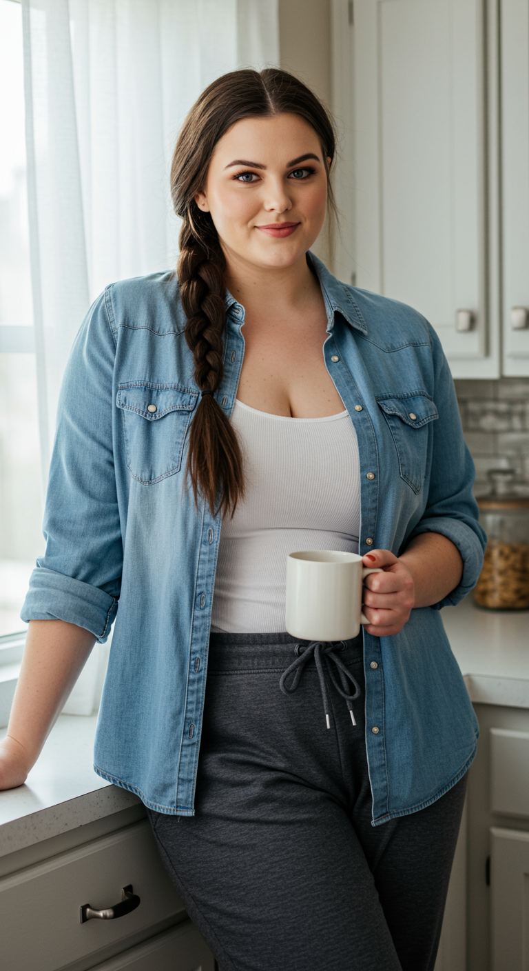 Inspired by a casual Americana aesthetic, this laid-back ensemble offers effortless comfort with a touch of classic style. The soft denim shirt, worn open over a ribbed white tank top, creates a relaxed silhouette perfectly complemented by the dark gray drawstring joggers. This versatile outfit suits a variety of body types, particularly those who prioritize comfort and a relaxed personal style, and is ideal for weekend errands, work-from-home days, or casual gatherings.