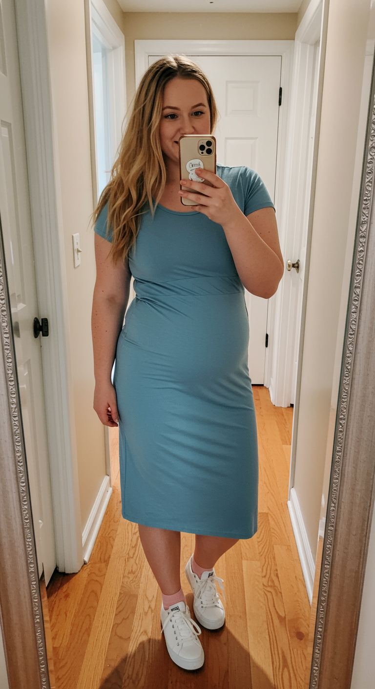 The soft, stretch jersey fabric of this aqua midi dress offers a smooth silhouette and exceptional comfort, making it a versatile choice for everyday wear. Its gentle scoop neck and short sleeves provide a relaxed yet put-together feel, suitable for various casual settings. This dress, paired with classic white sneakers and playful pink socks, creates an accessible and cheerful aesthetic that works well for apple or pear body types seeking comfortable style. Ideal for running errands, casual lunches, or relaxed weekend outings.