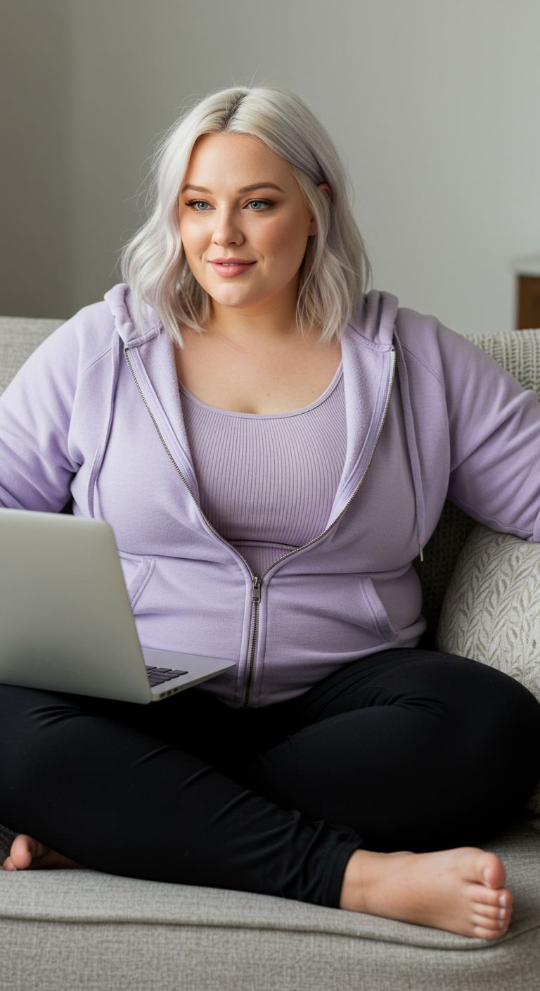 The subtle monochromatic layering of lavender tones sets this casual outfit apart, offering a harmonious and soft aesthetic. A ribbed tank top, slightly darker than the zip-up hoodie, adds textural interest while maintaining a cohesive palette. This comfortable pairing with black leggings creates a relaxed silhouette, ideal for those who prioritize ease without sacrificing thoughtful color coordination. It’s a perfect choice for working from home, running errands, or enjoying a cozy weekend, complementing various body types with its forgiving fit.