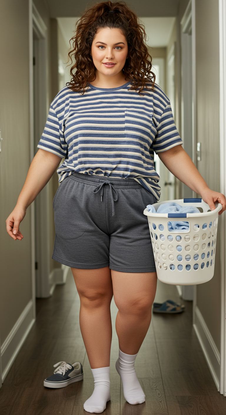 The half-tuck styling of the blue and white striped tee into dark grey sweat shorts creates an effortlessly casual and comfortable aesthetic. This combination offers a relaxed fit, ideal for those who prioritize ease and movement in their everyday wear. The soft textures and simple color palette make it perfect for lounging at home, running errands, or casual daytime outings, complementing a laid-back personal style.