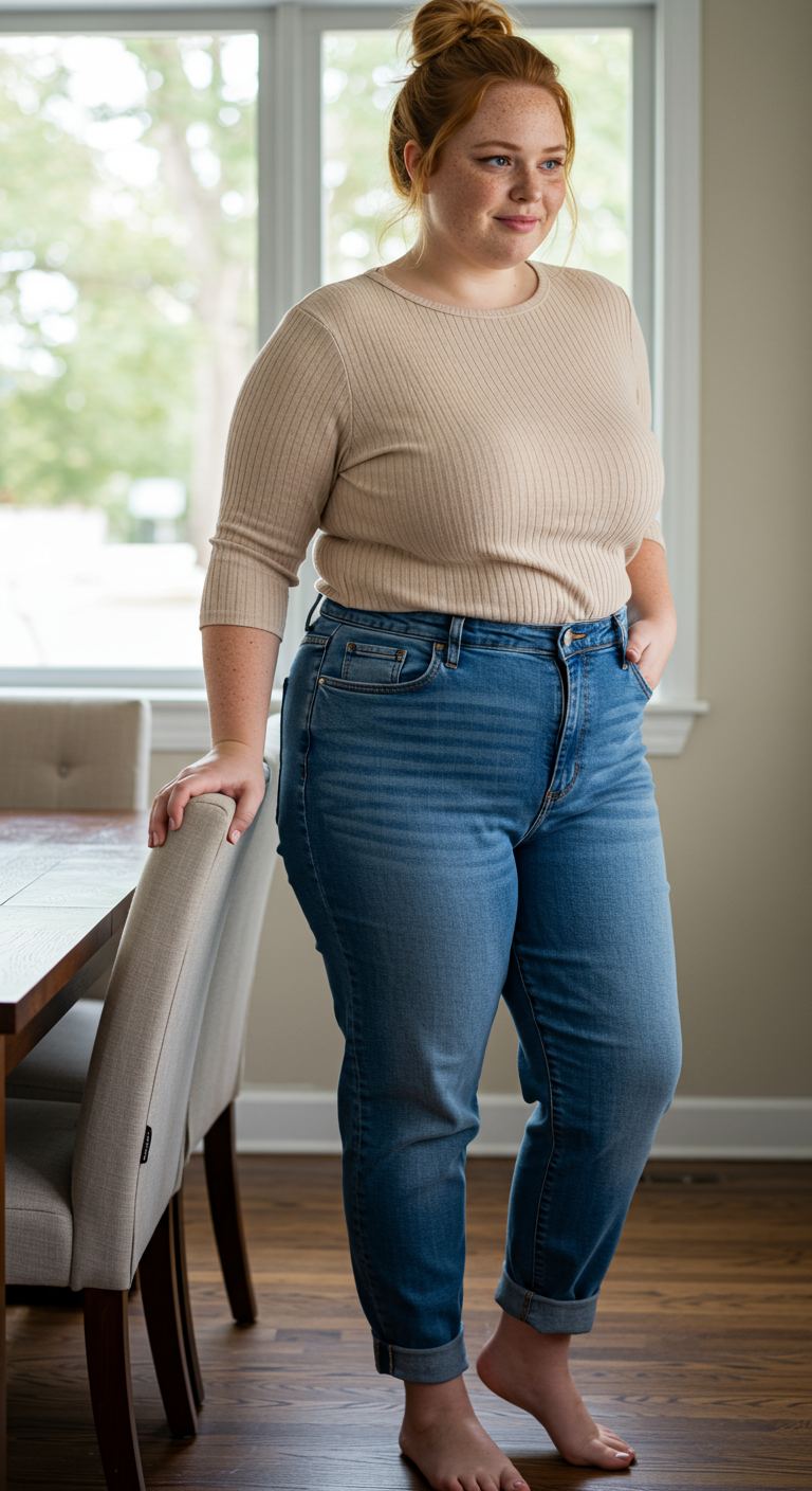 Perfect for a relaxed day at home or a casual outing, this ensemble offers effortless style. The ribbed knit top in a warm beige hue provides a soft texture and a comfortable fit, beautifully complementing the classic medium-wash jeans. With their slightly relaxed fit and cuffed ankles, the jeans create a balanced silhouette that flatters various body types. This simple yet chic combination is ideal for those who prioritize both comfort and a polished, understated look.