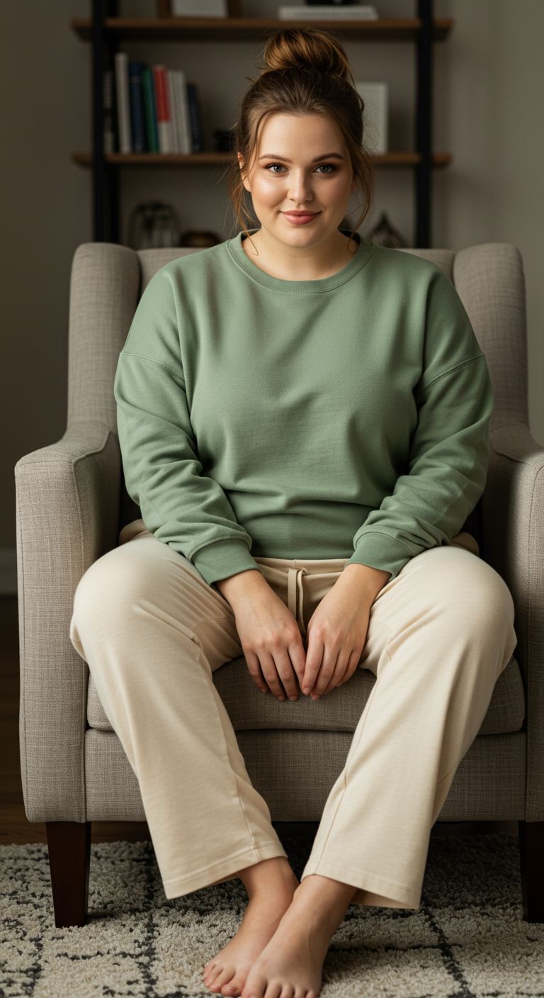 The relaxed, oversized sage green sweatshirt immediately establishes a mood of understated ease and modern comfort. Paired with soft, cream-colored joggers, this ensemble creates a harmonious, neutral palette that is both inviting and stylish. This outfit is ideal for those who prioritize coziness without sacrificing a polished aesthetic, complementing various body types with its forgiving silhouettes. Perfect for leisurely days at home, casual errands, or relaxed social gatherings, it epitomizes effortless, everyday chic.